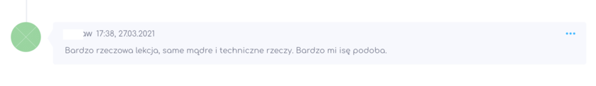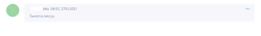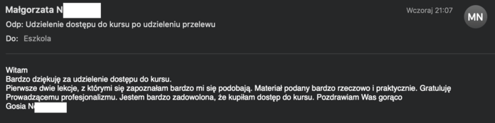 "Witam Bardzo dziękuję za udzielenie dostępu do kursu.Pierwsze dwie lekcje, z którymi się zapoznałam bardzo mi się podobają. Materiał podany bardzo rzeczowo i praktycznie. Gratuluję Prowadzącemu profesjonalizmu. Jestem bardzo zadowolona, że kupiłam dostęp do kursu. Pozdrawiam Was gorąco